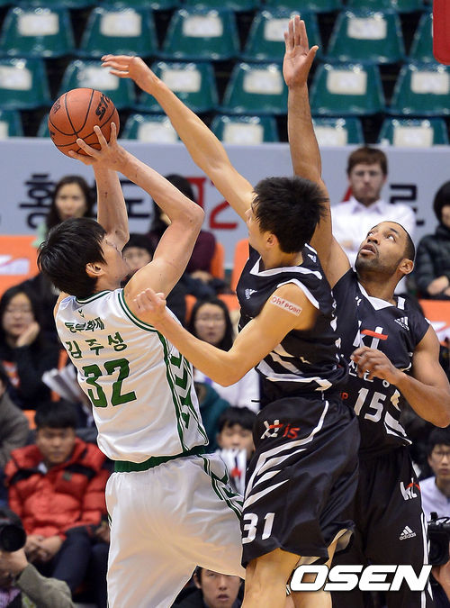 22일 오후 부산 사직실내체육관에서 열린 '2013-2014 KB국민카드 프로농구' 부산 KT와 원주 동부의 경기, 2쿼터 동부 김주성이 슛블록 당하고 있다