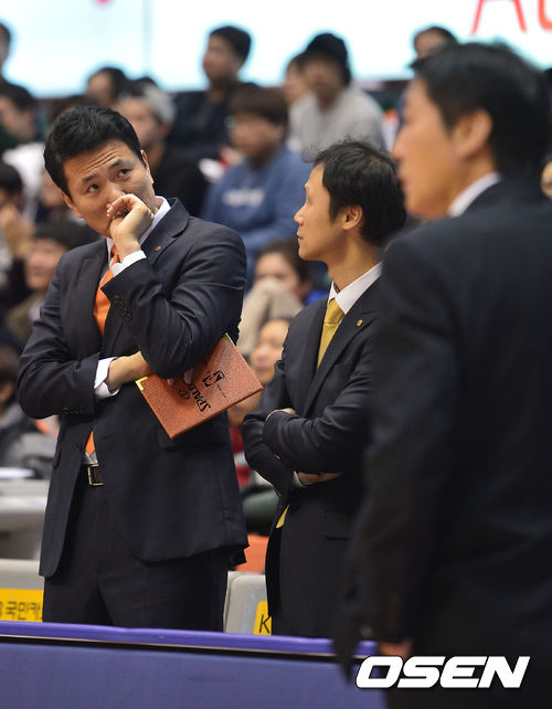 22일 오후 부산 사직실내체육관에서 열린 '2013-2014 KB국민카드 프로농구' 부산 KT와 원주 동부의 경기, 2쿼터 종료 후 동부 김영만 코치가 아쉬운표정을 짓고 있다
