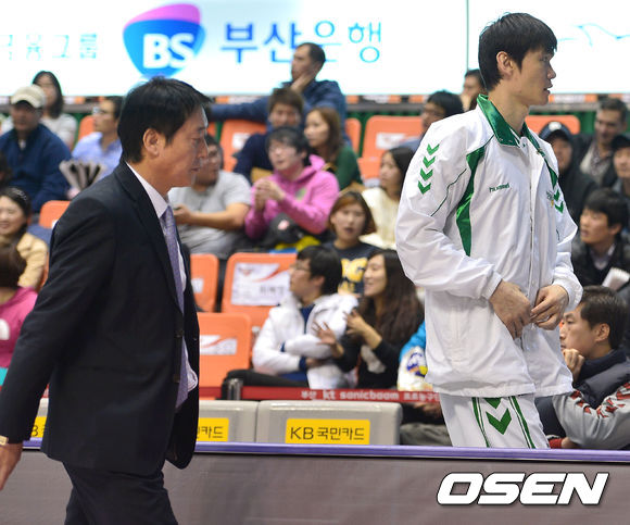 22일 오후 부산 사직실내체육관에서 열린 '2013-2014 KB국민카드 프로농구' 부산 KT와 원주 동부의 경기, 2쿼터 종료 후 동부 이충희 감독이 아쉬운 표정으로 퇴장하고 있다