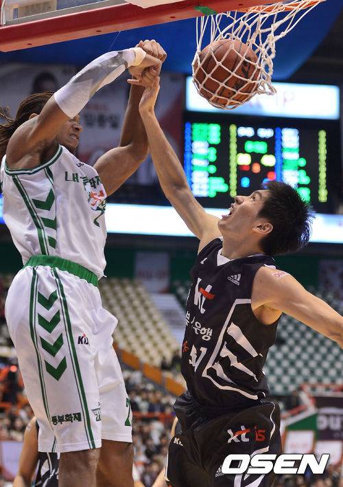 22일 오후 부산 사직실내체육관에서 열린 '2013-2014 KB국민카드 프로농구' 부산 KT와 원주 동부의 경기, 3쿼터 동부 렌들맨이 덩크슛을 성공하고 있다.