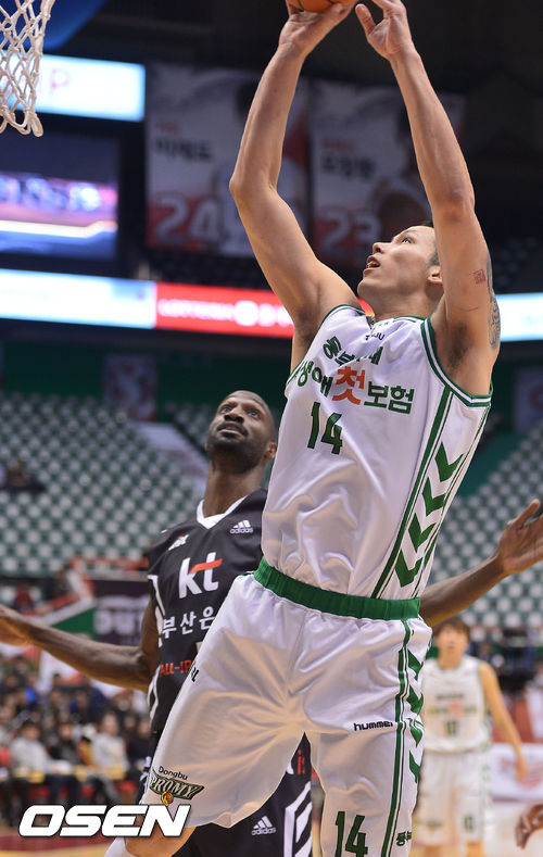 22일 오후 부산 사직실내체육관에서 열린 '2013-2014 KB국민카드 프로농구' 부산 KT와 원주 동부의 경기, 3쿼터 동부 이승준이 골밑슛을 성공하고 있다.