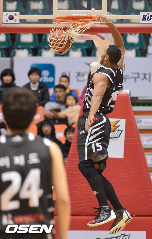 22일 오후 부산 사직실내체육관에서 열린 '2013-2014 KB국민카드 프로농구' 부산 KT와 원주 동부의 경기, 3쿼터 KT 클라크가 덩크슛을 성공하고 있다