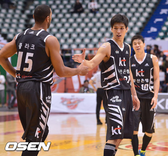 22일 오후 부산 사직실내체육관에서 열린 '2013-2014 KB국민카드 프로농구' 부산 KT와 원주 동부의 경기, 3쿼터 KT 장재석이 클라크와 하이파이브를 하고 있다. 장재석은 3쿼터에 스틸에 이은 패스 후 클라크가 덩크슛을 성공시켰다.