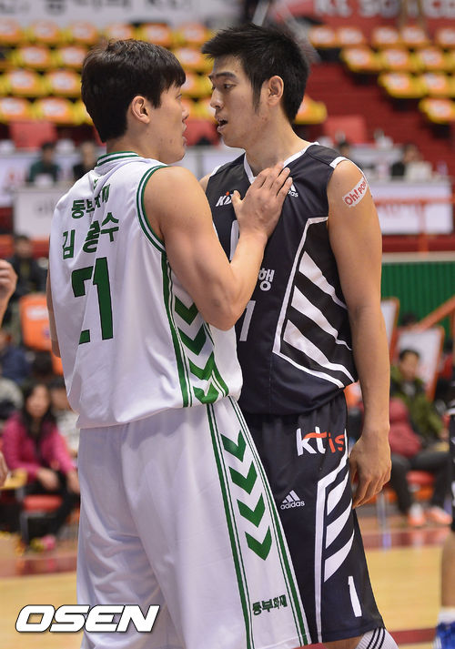 22일 오후 부산 사직실내체육관에서 열린 '2013-2014 KB국민카드 프로농구' 부산 KT와 원주 동부의 경기, 4쿼터 KT 민성주와 동부 김봉수가 험학한 분위기를 조성하고 있다