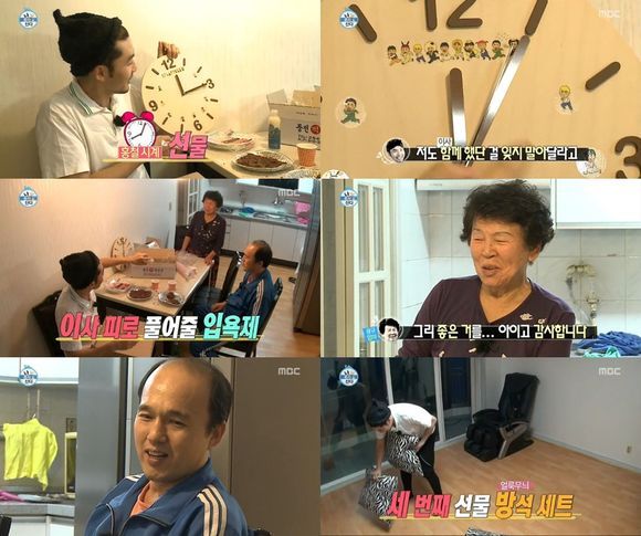 그는 김광규와 김광규의 어머니에게 "보니까 방에 늘 시계가 있더라. 그래서 내가 내 캐릭터가 그려져 있는 시계를 준비해왔다"라고 시계를 선물, 이후 욕조에 넣는 입욕제와 얼룩무늬 방석도 선물해 시선을 모았다.