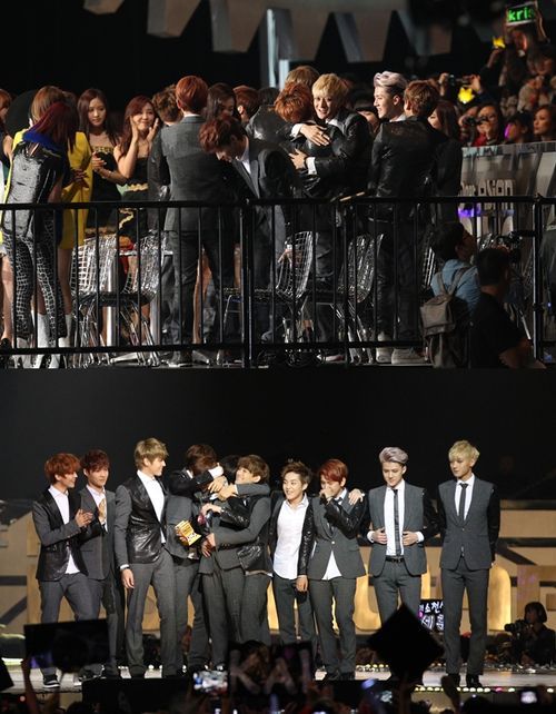‘2013 MAMA’에서 올해의 앨범상을 수상한 엑소가 서로를 껴안으며 수상의 기쁨을 나눴다.