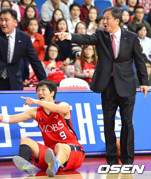 23일 오후 울산 동천실내체육관에서 열린 '2013-2014 KB국민카드 프로농구' 울산 모비스와 서울 삼성의 경기,3쿼터 모비스 유재학 감독과 천대현이 라인아웃 판정에 항의하고 있디.