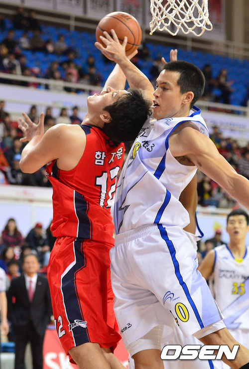23일 오후 울산 동천실내체육관에서 열린 '2013-2014 KB국민카드 프로농구' 울산 모비스와 서울 삼성의 경기,3쿼터 삼성 이동준이 모비스 함지훈의 백슛을 슛블록 시키고 있다.