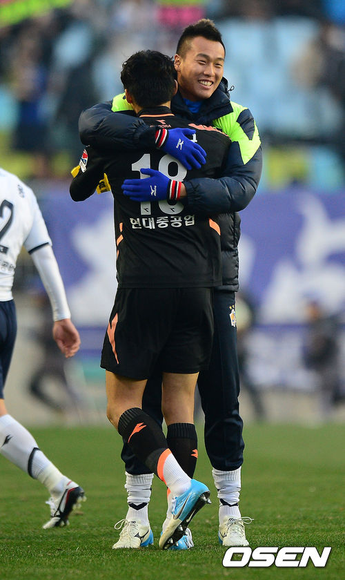 전반을 2대1로 앞서고 울산 김신욱이 김승규와 포옹을 하며 격려하고 있다.