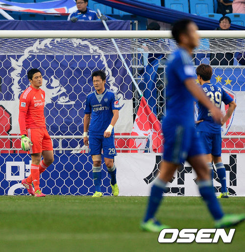 전반 수원 정성룡이 울산 김성환에 골을 허용하고 아쉬워하고 있다.