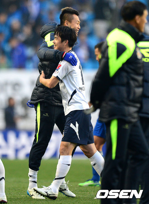 전반을 마치고 울산 김신욱이 2대 1로 앞서가는 골을 성공시킨 김성환과 기뻐하고 있다.
