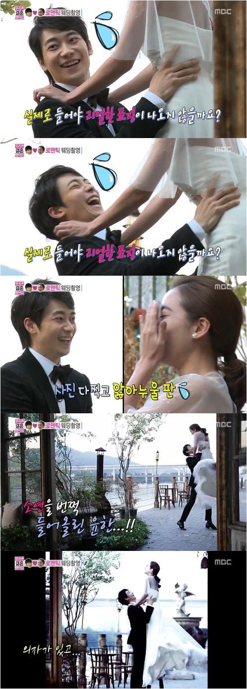 윤한이 가상 아내 이소연을 번쩍 드는 웨딩촬영을 한 후 엄살을 떨었다.