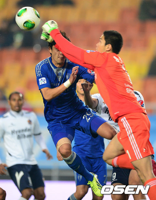 후반 수원 곽희주가 공중볼 과정에서 정성룡 골키퍼와 충돌하고 있다.