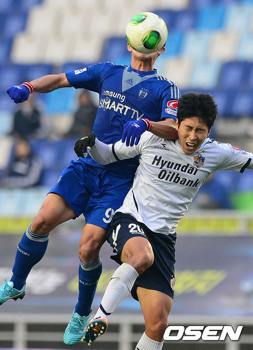 후반 수원 오장은과 울산 한상운이 공중볼을 다투고 있다.