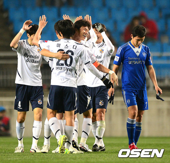 울산 현대는 23일 수원월드컵경기장에서 열린 현대오일뱅크 K리그 클래식 2013 38라운드 수원 삼성과 경기서 강민수와 김성환의 연속골에 힘입어 2-1 승리를 거두고 우승 문턱에 섰다.