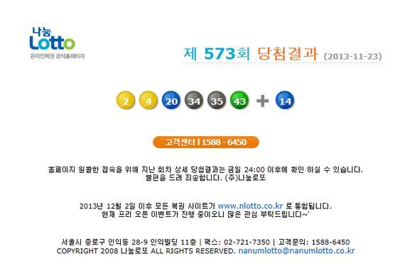 23일 추첨된 573회차 나눔로또 당첨번호는 '2, 4, 20, 34, 35, 43'이고 보너스 번호는 '14'이다.