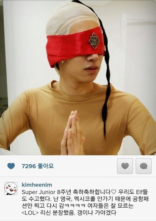한편 김희철은 지난 6일 자신의 인스타그램에 "슈퍼주니어 8주년 축하축하합니다. 우리도 ELF(팬클럽)들도 수고했다. 난 영국, 멕시코를 안 가기 때문에 공항 패션만 찍고 다시 감" 이라는 글과 함께 LOL 캐릭터 리신과 똑같이 분장한 코스프레를 해 화제를 모은 바 있다. 특히 그는 변발에 안대를 하고 합장 자세를 취하고 있어 보는 이들의 웃음을 자아냈다.