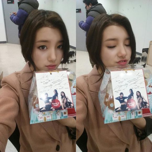 수지는 23일 오후 자신의 트위터를 통해 "별건 아니지만 맛있게 드셨길! 오늘 팬싸인회 와주신분들 오늘도 역시나 너무 즐거웠어요. 조심히 들어가세요. 들린다 들린다"라는 글과 함께 한 장의 사진을 게재했다.