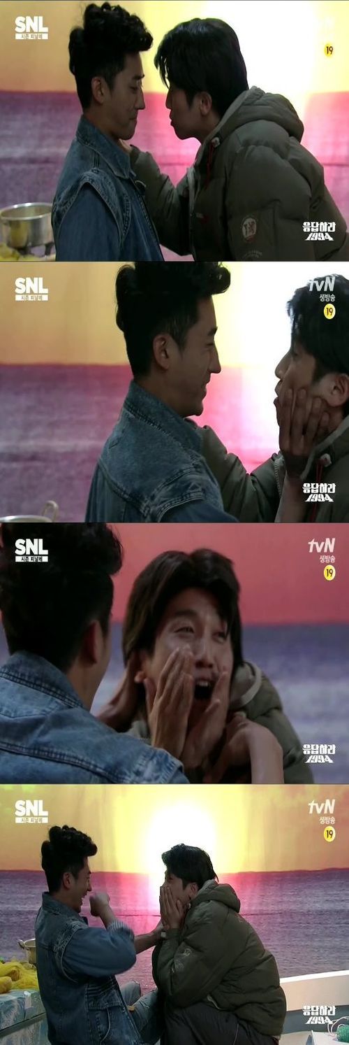 이날 '응답하라 1994'는 삼천포(김성균 분)와 조윤진(도희 분)의 일출 키스를 패러디해 웃음을 선사했다. 손호준은 조윤진의 역할로 삼천포 역의 유세윤과 함께 동성 간의 입맞춤을 연기해 박수를 받았다.