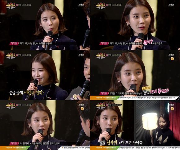 아이유는 23일 오후 방송된 JTBC '히든싱어 시즌2(이하 '히든싱어2')'에서 1라운드를 마친 뒤 "노래 듣고 '뭐지?'라는 생각을 했다"고 밝혔다.