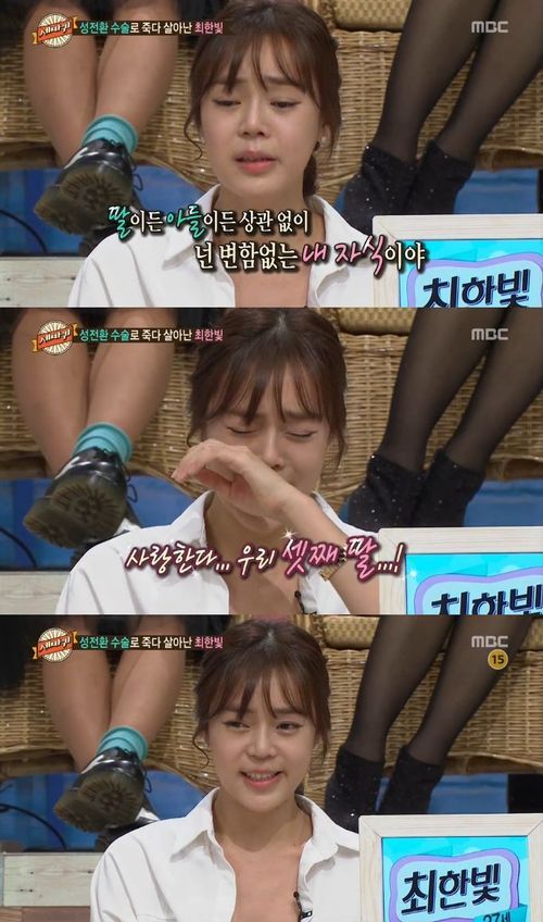 이후 아버지가 최한빛에게 전했던 말과 따뜻한 태도는 스튜디오에 큰 감동을 줬다. 최한빛은 "아버지가 들어오시더니, '네가 딸이든 아들이든 변함없는 내 자식이다. 사랑한다 우리 셋째 딸' 하시면서 안아 주셨다"며 "(수술로) 죽을 수도 있었는데 나는 이미 부모님께서 딸로 불러주셔서 수술하다 죽어도 그게 행복했다"라고 말해 다른 출연진의 눈물샘을 자극했다.
