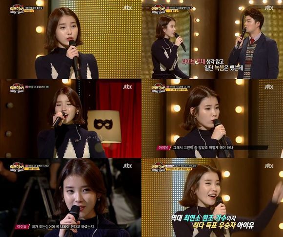 아이유는 23일 오후 방송된 JTBC '히든싱어 시즌2(이하 '히든싱어2')'에서 88표의 득표수로 최종우승을 차지했다.