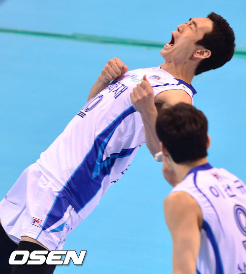 24일 오후 대전 충무실내체육관에서 열린 '2013-2014 프로배구 V리그' 남자부 삼성화재와 현대캐피탈의 경기, 1세트 삼성화재 고희진이 공격 성공후 환호하고 있다.