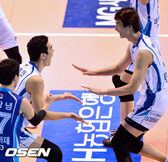 24일 오후 대전 충무실내체육관에서 열린 '2013-2014 프로배구 V리그' 남자부 삼성화재와 현대캐피탈의 경기, 1세트 삼성화재 박철우가 공격 성공후 고희진과 하이파이브를 하고 있다.