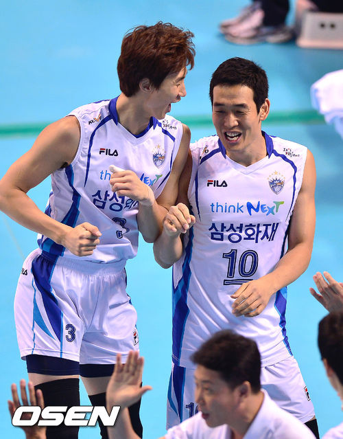 24일 오후 대전 충무실내체육관에서 열린 '2013-2014 프로배구 V리그' 남자부 삼성화재와 현대캐피탈의 경기, 1세트 작전타임때 삼성화재 박철우와 고희진이 기뻐하고 하고 있다.