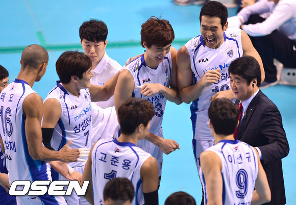 24일 오후 대전 충무실내체육관에서 열린 '2013-2014 프로배구 V리그' 남자부 삼성화재와 현대캐피탈의 경기, 2세트 계속되는 공격에 삼성화재 선수들이 기뻐하고 있다