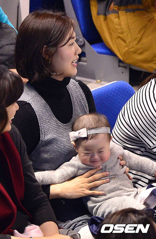24일 오후 대전 충무실내체육관에서 열린 '2013-2014 프로배구 V리그' 남자부 삼성화재와 현대캐피탈의 경기, 삼성화재 박철우 아내 신혜인이 딸과 함께 경기를 관전하고 있다.