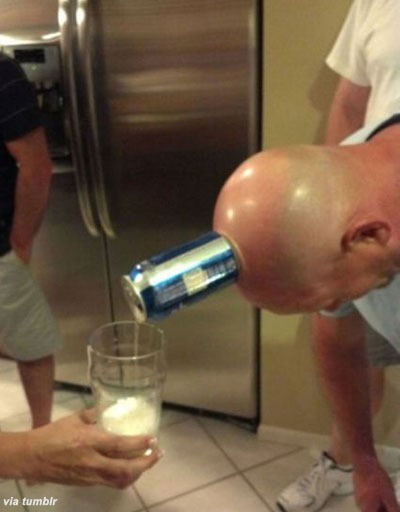 사진에서 머리가 백구인 아빠가 캔을 머리에 붙인채 컵에 내용물을 따르는 장면이 담겨 있다.