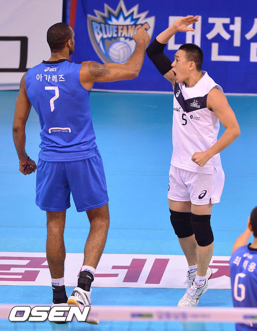 24일 오후 대전 충무실내체육관에서 열린 '2013-2014 프로배구 V리그' 남자부 삼성화재와 현대캐피탈의 경기, 1세트 현대캐피탈 여오현과 아가메즈가 환호하고 있다.