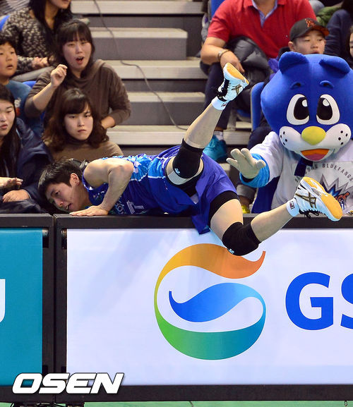 24일 오후 대전 충무실내체육관에서 열린 '2013-2014 프로배구 V리그' 남자부 삼성화재와 현대캐피탈의 경기, 3세트 삼성화재 김강녕이 몸을 날려 공을 살려내고 있다.