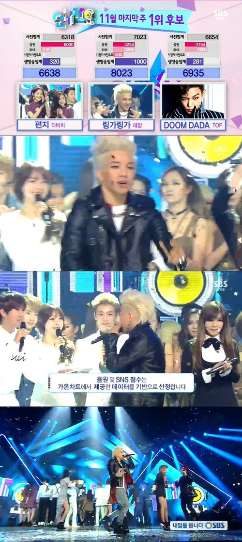 태양은 24일 방송된 SBS '인기가요'에서 여성듀오 다비치, 탑과 1위 후보로 오른 가운데 1위에 올랐다.