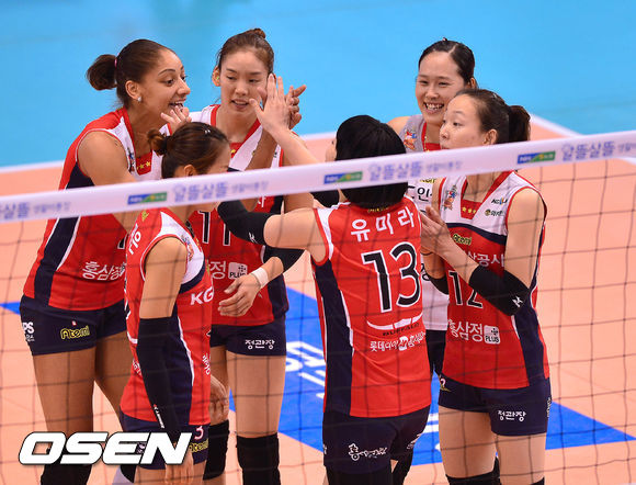 24일 오후 대전 충무실내체육관에서 열린 '2013-2014 프로배구 V리그' 여자부 KGC인삼공사와 IBK기업은행의 경기, 1세트 인삼공사 공격 성공후 기뻐하고 있다.
