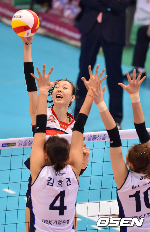 24일 오후 대전 충무실내체육관에서 열린 '2013-2014 프로배구 V리그' 여자부 KGC인삼공사와 IBK기업은행의 경기, 1세트 인삼공사 백목화가 강타를 날리고 있다.