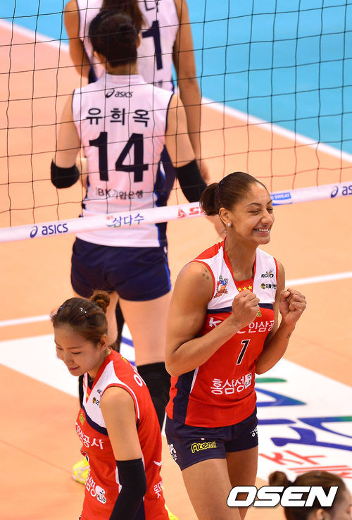 24일 오후 대전 충무실내체육관에서 열린 '2013-2014 프로배구 V리그' 여자부 KGC인삼공사와 IBK기업은행의 경기, 2세트 인삼공사 조이스가 공격 성공후 미소 짓고 있다