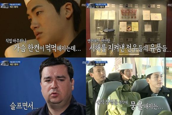 이날 멤버들은 전입 이전에 먼저 연평해전 당시 순직한 수병들의 군복 등을 전시한 곳을 방문했다. 멤버들은 순직 수병들의 군복과 군번줄, 가족들이 보낸 편지를 보며 슬픈 표정을 감추지 못했다.