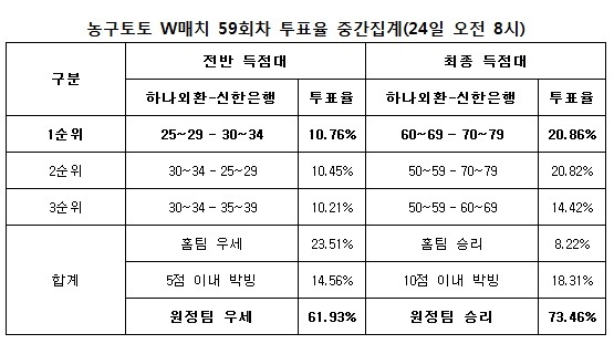 [농구토토] 국민체육진흥공단(www.kspo.or.kr)이 발행하는 체육진흥투표권 수탁사업자인 스포츠토토 공식 온라인 발매사이트인 베트맨(www.betman.co.kr)이 오는 25일 오후 7시 부천실내체육관에서 벌어지는 하나외환-신한은행전을 대상으로 한 농구토토 W매치 59회차 투표율을 중간 집계한 결과, 참가자의 73.46%는 신한은행의 승리를 예상하는 것으로 나타났다.