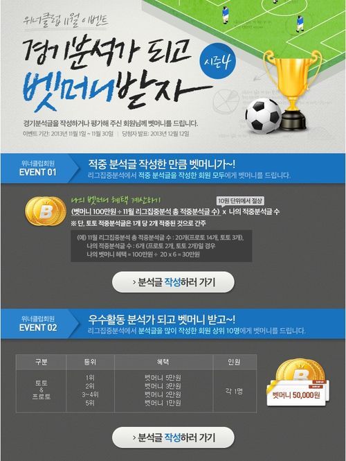 이밖에 회원들이 작성한 리그집중분석글을 평가하는 '분석 평가자에게 벳머니를~!' 이벤트를 통해 모두 20명에게 벳머니 1만원권을 증정한다. 단 평가는 발매 중인 게시글에 한해 가능하다.