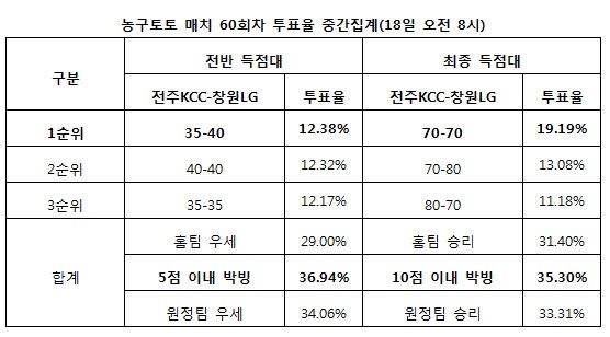 국민체육진흥공단(www.kspo.or.kr)이 발행하는 체육진흥투표권 수탁사업자 스포츠토토의 공식 온라인 발매사이트인 베트맨(www.betman.co.kr)이 오는 26일 오후 7시 전주실내체육관에서 열리는 KCC-창원LG전을 대상으로 한 농구토토 매치 60회차 투표율을 중간 집계한 결과, 35.30%가 양 팀의 10점차 이내 박빙 승부를 예상했다고 전했다. 홈팀 KCC의 승리를 예상한 참가자는 31.40%, 나머지 33.31%는 창원LG의 우세를 전망했다.