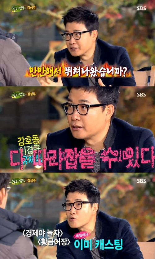 MC 이경규가 "예능바닥이 만만해 보여서 뛰쳐나왔냐"고 물었다. 이에 김성주는 "충분히 유재석, 이경규, 강호동 다 따라잡을 수 있었다. 열악한 상황에서도 인정받았다"며 "뒷받침만 되면 충분히 할 수 있는 재능이있다"고 강한 자신감을 가졌던 당시를 회상했다.