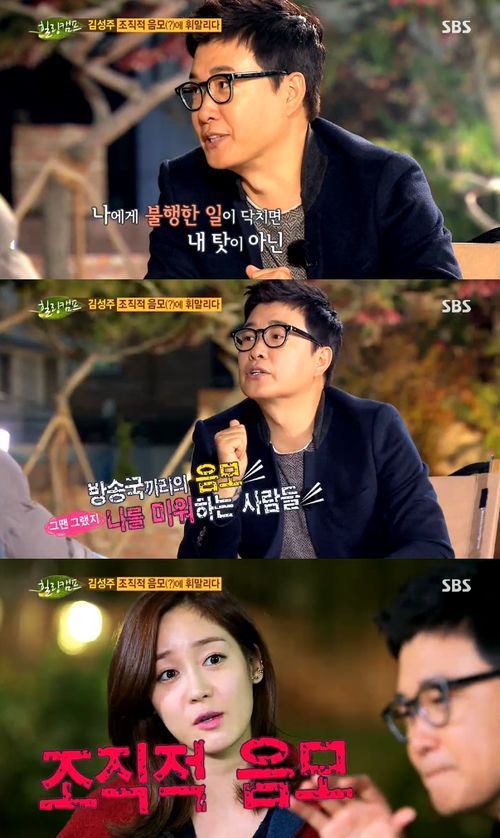 김성주는 25일 방송된 SBS '힐링캠프, 기쁘지 아니한가'(이하 힐링캠프)에서 "조직적인 음모 때문에 일을 하지 못한다고 생각했다"고 말했다.