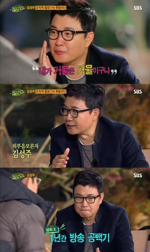 김성주는 지난 25일 방송된 SBS 예능 프로그램 '힐링캠프, 기쁘지 아니한가'에 출연해 MBC 아나운서로 재직 시절 맛봤던 황금기를 떠올렸다. 그는 "프리 선언을 한 후, 1년 간 섭외가 없었다. 나는 능력이 출중한데 나를 미워하는 사람, 방송국끼리의 음모가 있다고 생각했다. '내가 거물은 거물이구나'는 생각도 들었다"고 밝혀 웃음바다를 만들었다.