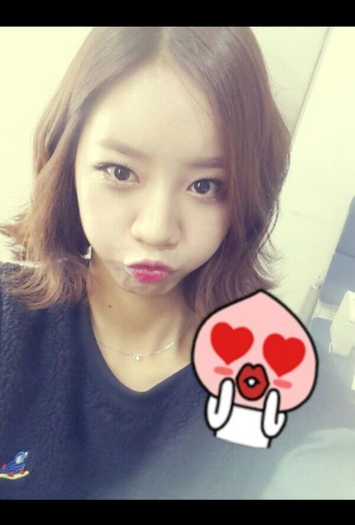 사진에서 혜리는 단발 머리의 웨이브를 하고 매력을 뽐내고 있다. 사진 속 이모티콘의 모양을 따라하듯, 입을 앞으로 삐죽 내밀고 표정을 지어 귀여움을 더한다.