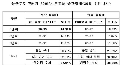 농구토토 W매치 60회차 투표율 중간집계 결과…최종 60-70점대 KB스타즈 우세