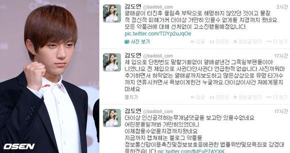 김도연은 지난 25일 자신의 트위터를 통해 "더이상 인신공격하는 무개념 댓글들 보고만 있을 수 없네요. 어린 분들일까봐 가만히 있었더니 이제 참을 수 없는 지경까지 왔네요. 지금까지 캡처해놓은 블로그, 악플들 정보통신망이용촉진 및 정보보호 등에 관한 법률위반 및 모욕죄로 강경대응하겠습니다"라는 글을 게재했다.