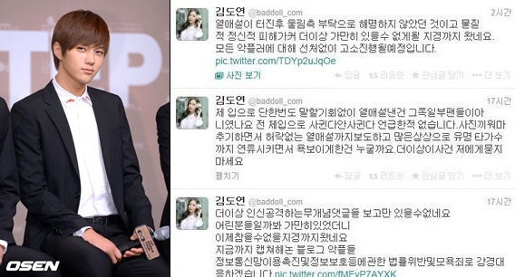 김도연은 앞서 지난 25일과 이날 오전 두 차례에 걸쳐 게재한 글을 통해 엘과 열애한 것이 맞다고 인정하며 열애설 이후 두 달 동안 받은 악플을 더 이상 참지 않겠다고 경고해 큰 화제를 모으고 있다.