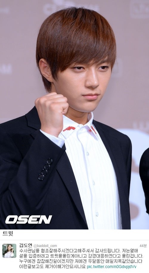 김도연은 26일 오후 자신의 트위터를 통해 "수사관님들 협조 잘 해주시겠다고 해주셔서 감사드립니다. 저는 열애설을 입증하려고 트윗을 올린 게 아니고 강경대응하겠다고 올린 겁니다"라는 글을 게재했다.